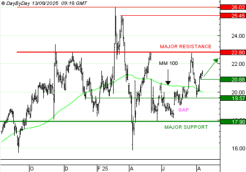 ALSTOM évolue dans une large zone de consolidation entre 17,9 euros et 22,8 euros depuis novembre 2024. Le titre a fait deux excès de part et d’autre de cette zone, mais brefs. Depuis l’été, il gravit à nouveau dans cet espace et devrait revenir tester le haut de la zone à 22,8 euros.