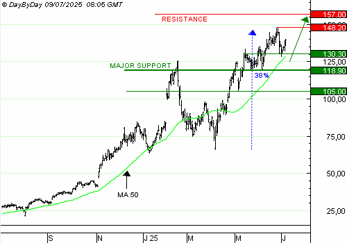 PALANTIR TECHNOLOGIES a rejoint plusieurs sommets historiques successifs au cours des dernières semaines. La tendance haussière est soutenue par la moyenne mobile à 50 jours. Le titre donne des preuves de force régulières. La dernière est un rebond sur le précédent sommet à 130,3 dollars, proche de la moyenne. La tendance peut se poursuivre vers le sommet récent à 148,2, puis un nouveau record sur la résistance théorique à 157 dollars.