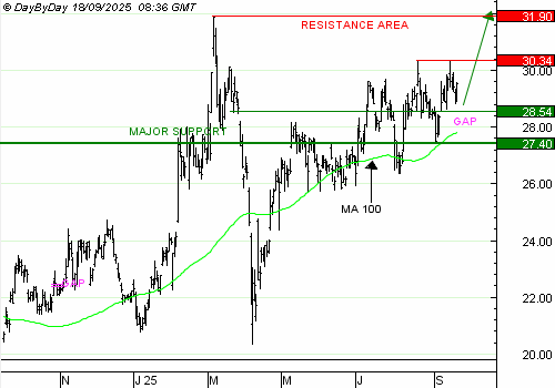 ARCELOR MITTAL n’a cessé de remonter depuis » Liberation day », s’installant lentement au-dessus de la moyenne mobile à 50 jours haussière et établissant une succession ce creux et de sommets ascendants qui définissent une tendance haussière à court terme. Début septembre, la valeur a ouvert un gap haussier. La récente consolidation laisse ce gap ouvert, ce qui est un signe de force. La hausse peut se poursuivre jusqu’à tester le record de 2025 à 31,9 euros, avec une résistance intermédiaire à 30,34 euros. La rupture du dernier creux, à 27,4 euros, invaliderait cette tendance haussière.