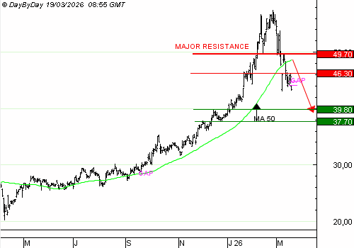 Cette tendance baissière serait invalidée par le franchissement de la résistance majeure à 49,7 euros.