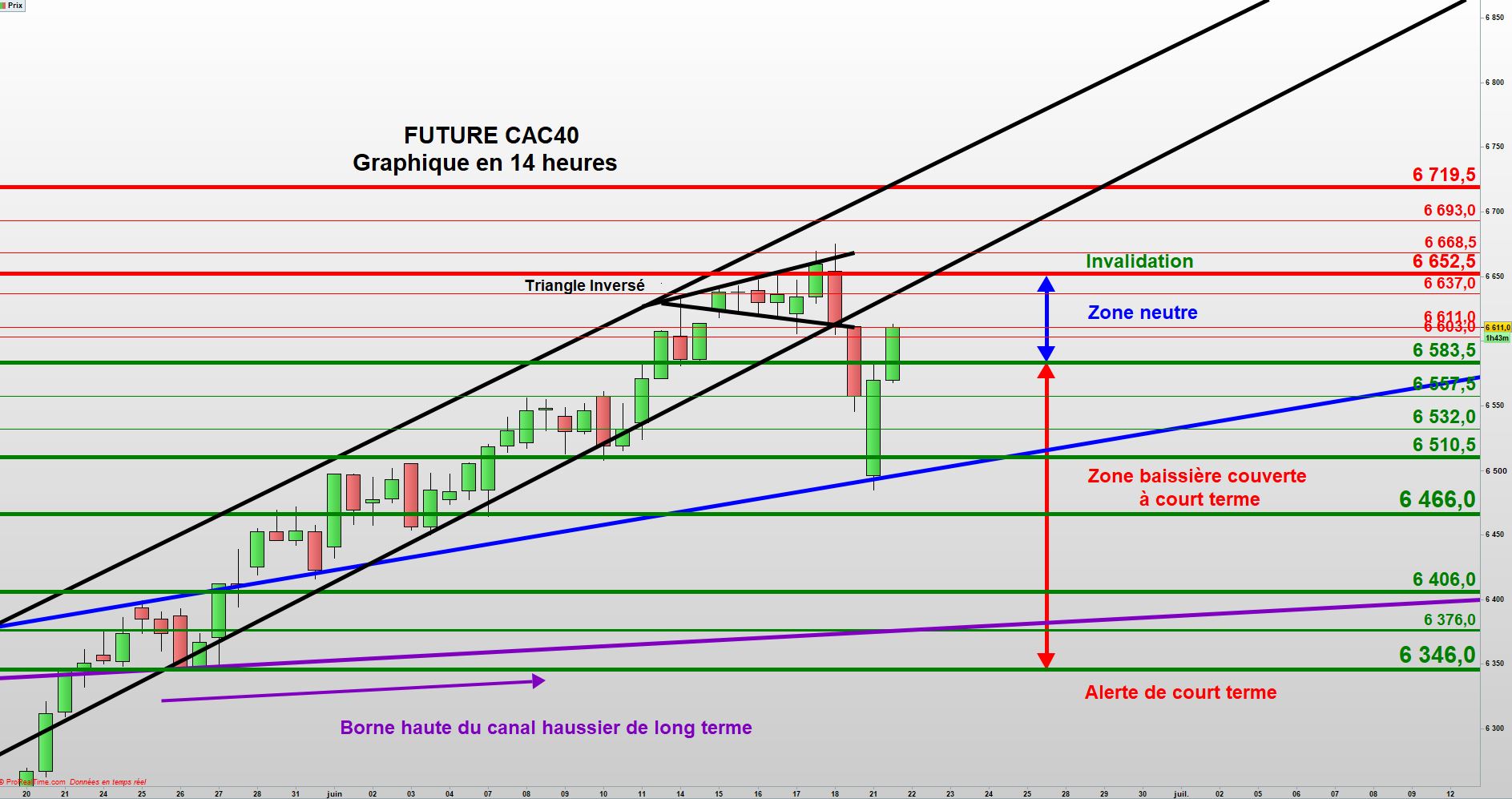La réintégration de sa borne basse, située à 6643 pour la séance du 22 juin et surtout, le débordement de la résistance à 6652,5, réactiverait la tendance haussière.