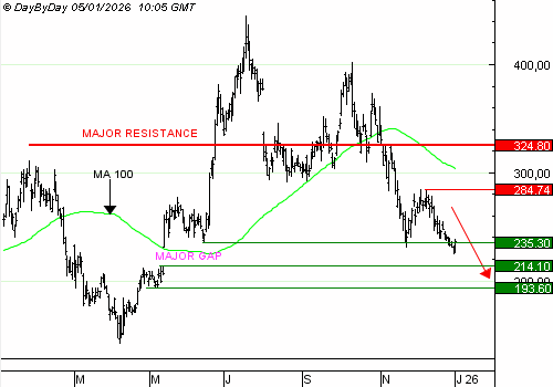 Coinbase a poursuivi sa lente baisse. Le support à 235,3 dollars n'est pas nettement enfoncé, il pourrait interrompre une fois encore la baisse. Nous débouclons donc cette position.