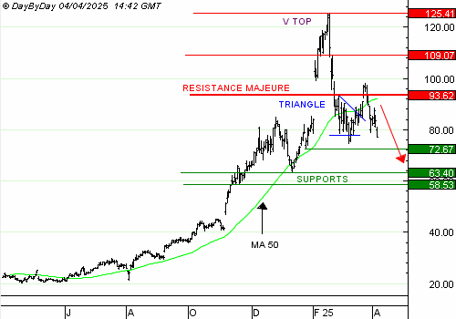 Palantir ne suit pas le chemin que nous avions envisagé. Après la sortie par le bas d'un triangle, la figure a été réintégrée, et Palantir a bien rebondi. Pour le moment, la figure en V-Top ne donne pas d'effet majeur. Cela viendra peut-être la semaine prochaine, mais nous proposons d'alléger la position par prudence.