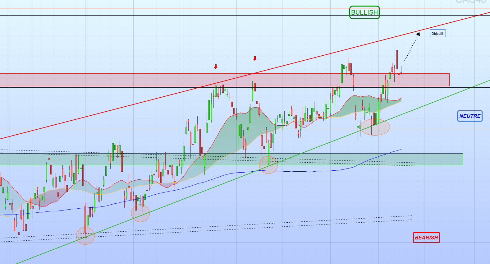 A l’inverse, l’indice devra impérativement défendre la zone des 8 247 points, ancienne résistance désormais convertie en support clé. En l’absence de catalyseurs haussiers ou en cas de flux d’actualités défavorables, un retour dans l’ancien range 8 030–8 162 points resterait envisageable, traduisant un essoufflement du momentum acheteur au profit d’une reprise en main par les vendeurs. Dans ce scénario, un pullback vers la base du canal ascendant, vers 8 014,5 points, ne serait pas à écarter. Tant que ce niveau tient en clôture, la structure haussière de moyen terme demeurerait intacte. En revanche, une cassure franche en clôture fragiliserait la lecture technique et pourrait enclencher une phase de consolidation plus marquée, avec des cibles potentielles sur 7 731 puis 7 603 points, correspondant à d’anciennes zones de polarité et de congestion.
