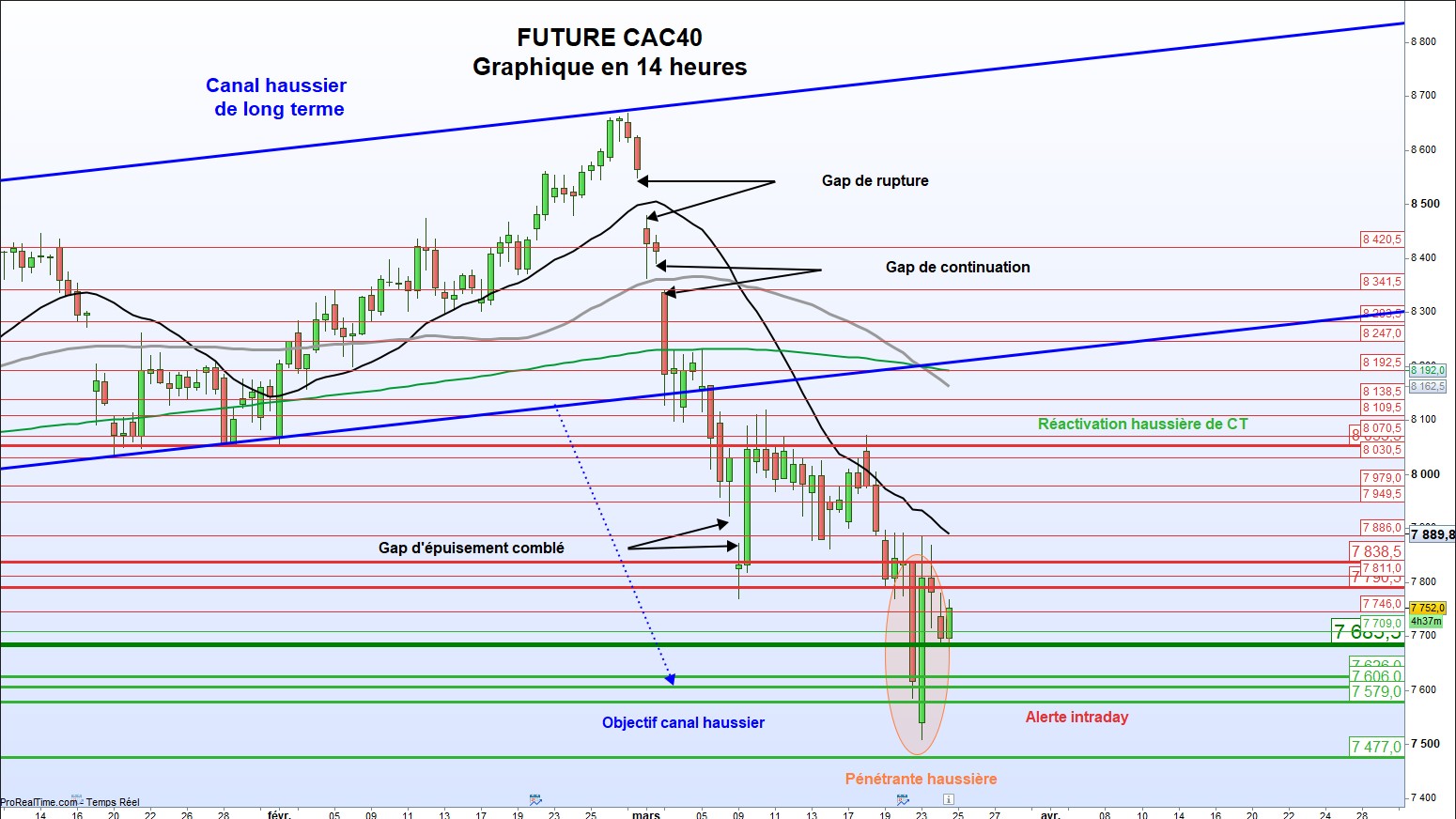 Graphiquement, le Future CAC 40 (cf. graphique en données 14 heures) a formé une pénétrante haussière à proximité de l’alerte intraday, après avoir atteint la cible supérieure du canal haussier de long terme, établie à 7 606 points. Un franchissement de la résistance intermédiaire, positionnée à 7 838,5 points, viendrait confirmer le rebond, qui demeure pour l’instant technique, à l’issue d’une phase de consolidation de plus de 13 % depuis le 27 février, et aurait pour objectif la zone de réactivation haussière de court terme à 8 053,5 points. Par ailleurs, un franchissement de ce seuil pivot constituerait le signal précurseur d’une fin de consolidation, qui ne serait validée qu’en cas de réintégration du canal haussier à 8 210 points. Le comblement des gaps de continuation et de rupture, situés respectivement à 8 391 et 8 549,5 points, favoriserait la poursuite de la dynamique haussière, permettant une extension vers 8 740 points. Au‑delà de ce niveau, la figure de retournement en triple top serait invalidée, ouvrant la voie à une cible théorique positionnée à 9 570 points.