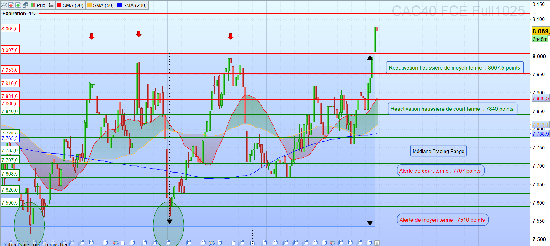 Graphiquement, le Future CAC 40 (cf. données 14 heures) a envoyé un signal positif en sortant par le haut du range dans lequel il évoluait depuis la fin du printemps. Après une phase de consolidation entre 7 535 et 8 007,5 points, la tendance redevient haussière, invalidant ainsi la configuration baissière précédente. Le franchissement en clôture du seuil des 8 007,5 points relance la dynamique de moyen terme, avec une première résistance à 8 065 points. Un dépassement de ce niveau pourrait ouvrir la voie à une accélération vers les sommets historiques, dont le franchissement déclencherait une nouvelle impulsion en direction des 8 395 points. À plus long terme, trois clôtures franches au-dessus des 8 235 points (ancien sommet historique) renforceraient le scénario d’une hausse plus soutenue, avec un objectif théorique fixé au seuil symbolique des 8 500 points.