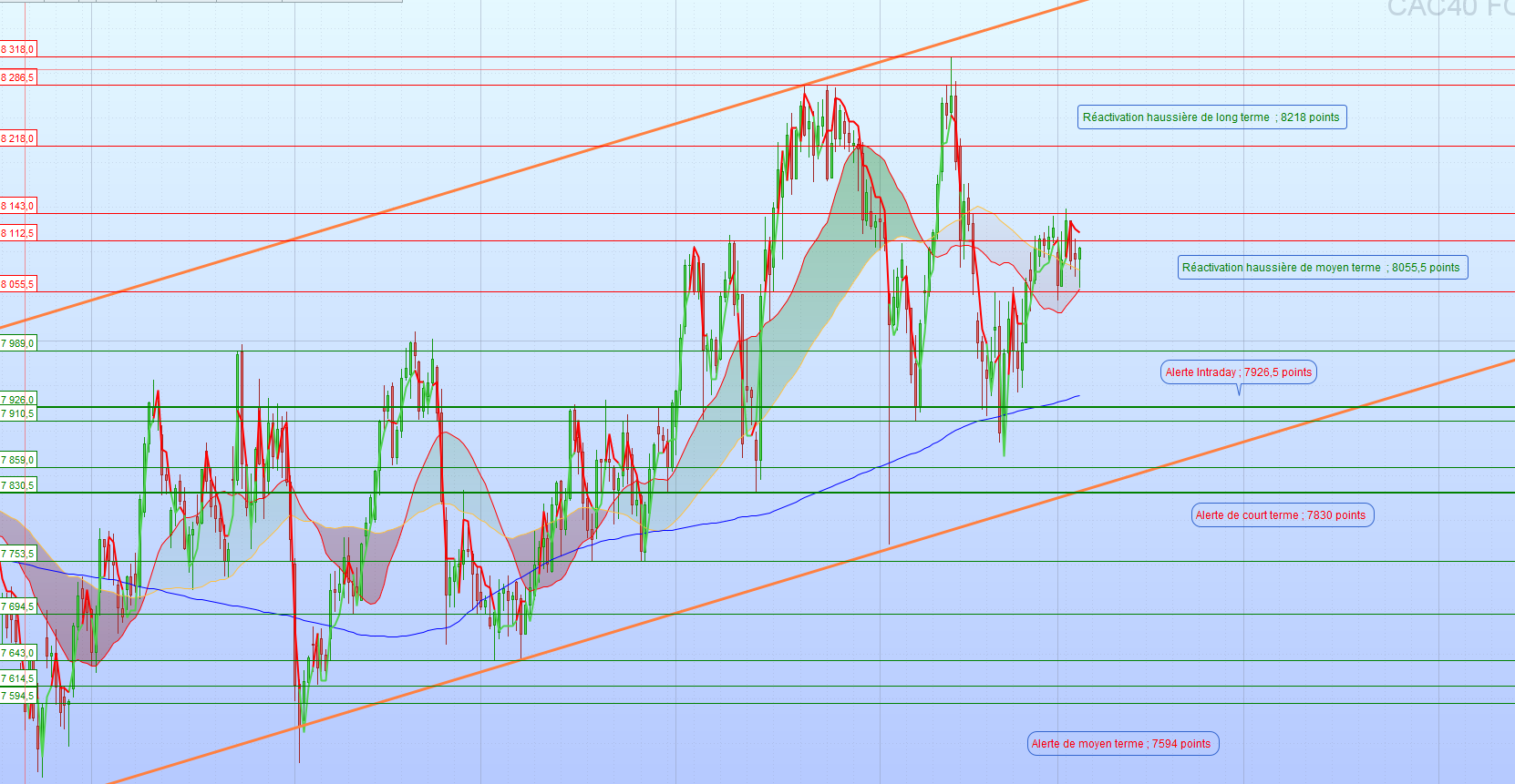 Graphiquement, le Future CAC 40 (données en 14h) évolue toujours dans les limites de son canal haussier de long terme. L’indice conserve son signal intraday tant qu’il reste au-dessus de 7 926,5 points, et la dynamique haussière de moyen terme a pu être relancée par les acheteurs. Pour poursuivre ce mouvement, le marché devra montrer davantage de force afin de franchir les résistances situées à 8 112,5, 8 143 et 8 218 points. Au-delà, l’objectif naturel se situerait à proximité de la borne haute du canal, autour de 8 360 points, dont un dépassement durable validerait une tendance haussière plus ancrée.