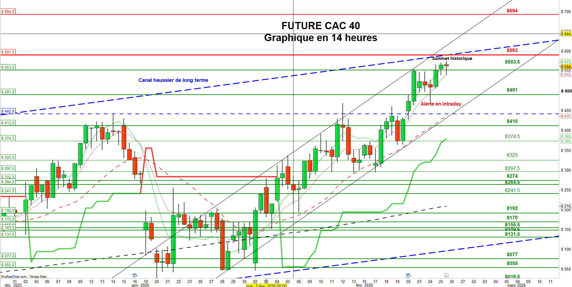 Pour confirmer une poursuite de la hausse, l’indice devra franchir nettement la zone des 8 575 / 8 600 points, avec des volumes soutenus et sur au moins deux à trois séances consécutives. Un tel dépassement ouvrirait la voie à une extension du mouvement en direction des 8 694 puis 8 797 points.