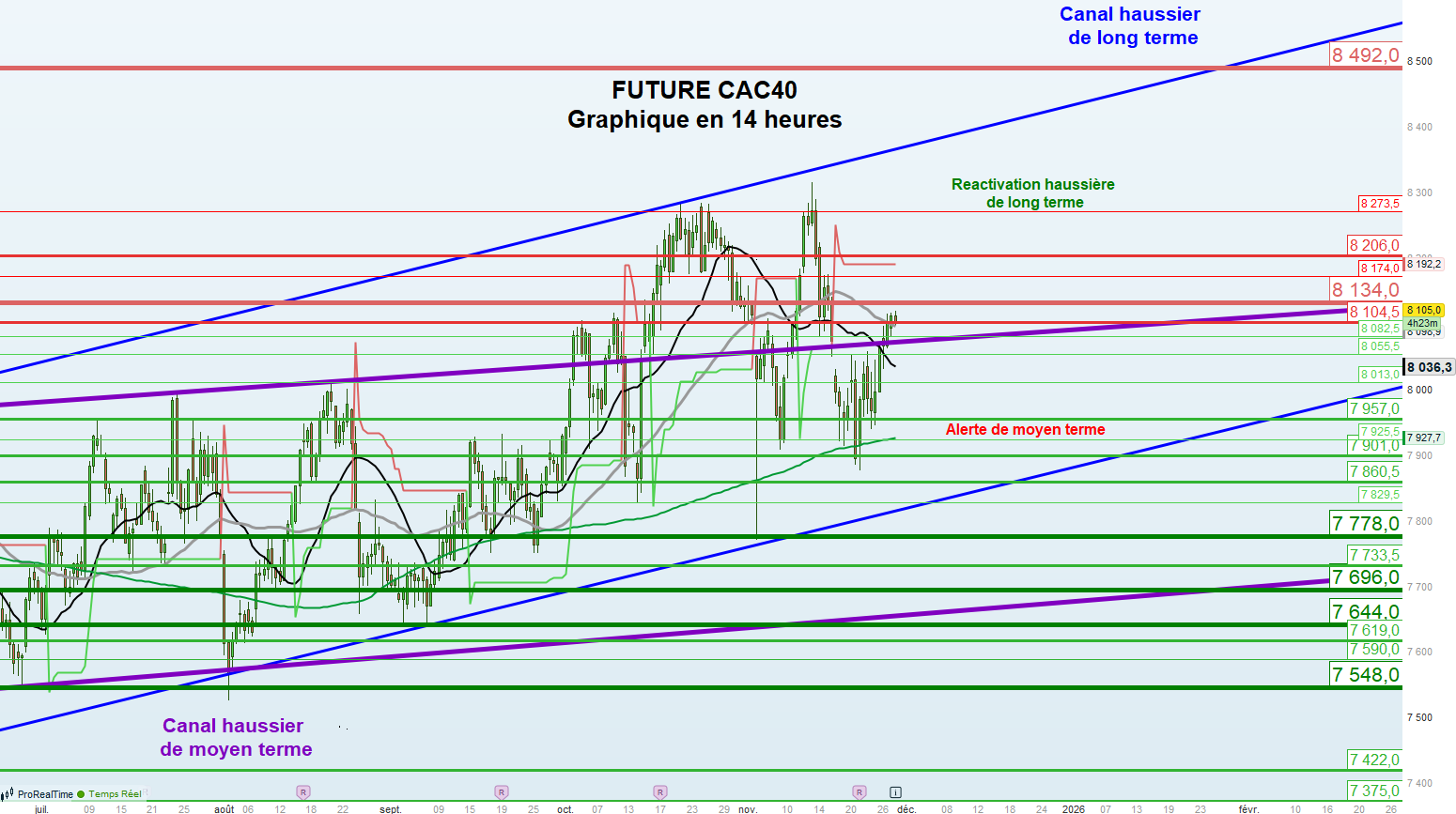 , le Future CAC 40 (cf. graphique en données 14 heures) est parvenu à se réinstaller au-dessus de la borne haute de son canal haussier, après avoir préservé le niveau d’alerte situé à 7 957 points. Un débordement en clôture des 8 104,5 points constituerait un signal précurseur d’achèvement de la phase de consolidation, ouvrant la voie à une séquence plus directive, qui pourrait conduire aux plus hauts historiques en cas de franchissement confirmé de la résistance majeure des 8 134 points. Seul un débordement en force, validé en clôture au-delà de ces niveaux techniques, réactiverait la dynamique haussière de long terme, avec un objectif à 9 364 points, obtenu par réplication.