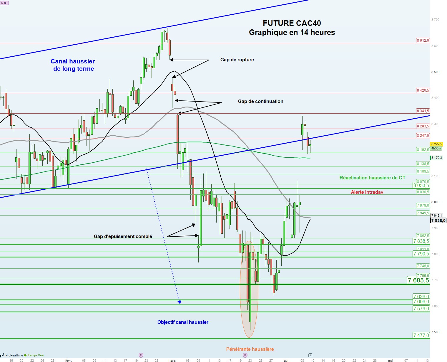 Les supports sont : 8192,5 et 8138,5 voire 8109,5 puis 8070,5 et 8053,5 voire 8030,5 puis 7979 et 7949,5 puis 7862,5 voire 7838,5 et 7811 puis 7790,5 voire 7746 et 7709 puis 7685,5 voire 7626 puis 7606 et 7579 voire 7477 puis 7328,5 et 7200 voire 7092,5 puis 7466,5 et 7330 voire 7164.