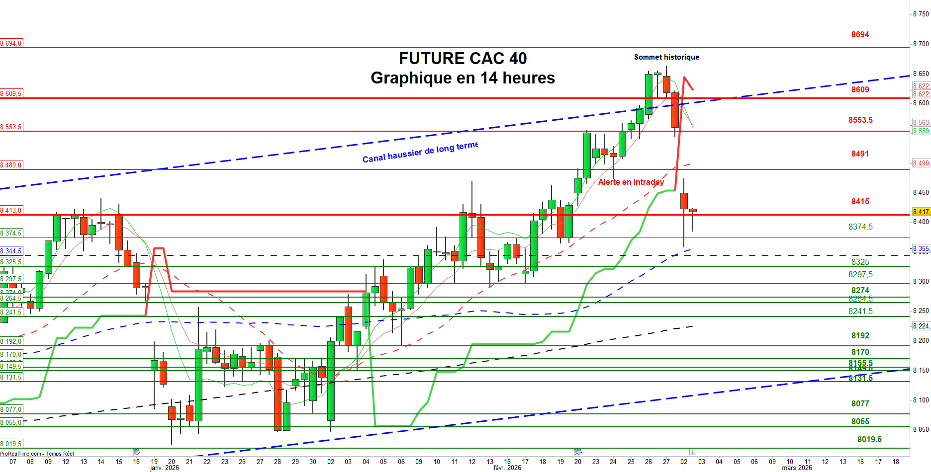 Les supports sont : 8374,5 voire 8355 et 8338 puis 8326 voire 8279,5 et 8212 puis 8191,5 voire 8139 puis 8131 et 8065 puis 8048 voire 8026 et 7991,5