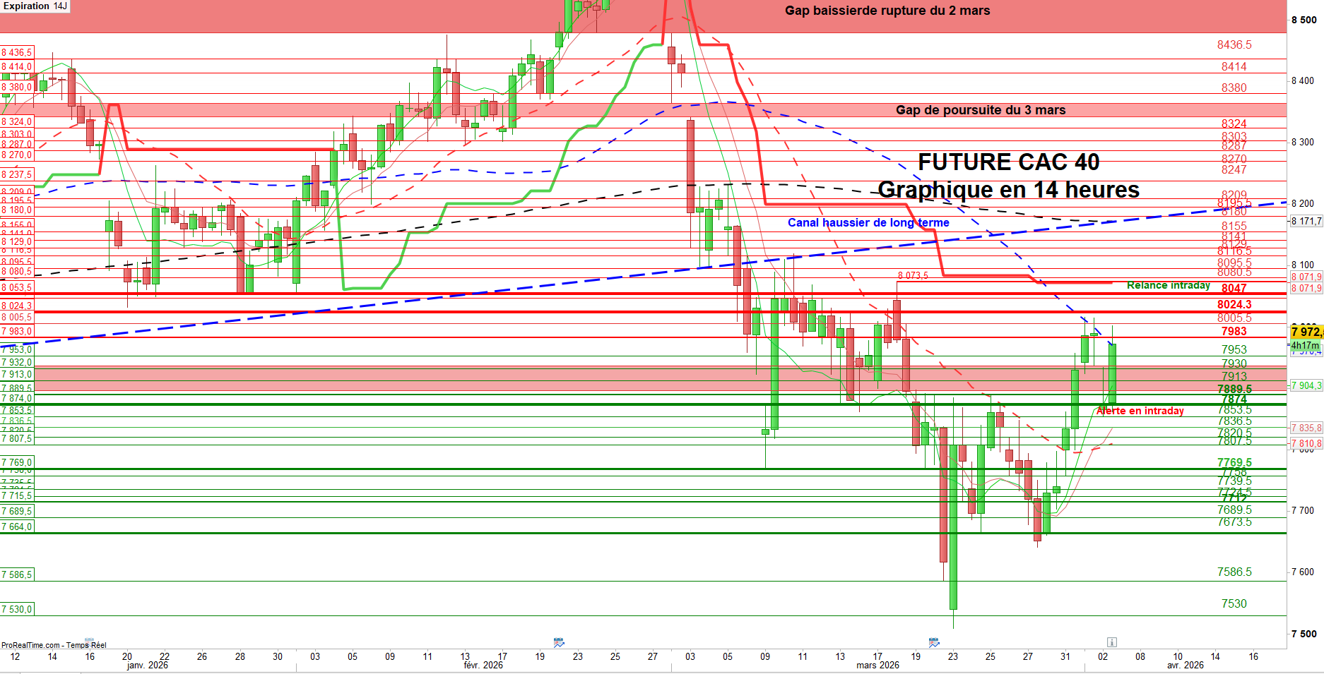 Pour relancer plus franchement la dynamique, un franchissement du point haut du 1er avril, situé à 8 016,50 points, constituerait une première étape constructive. Dans un second temps, le dépassement du sommet du 18 mars à 8 073,50 points viendrait renforcer ce scénario. Au-delà, la réintégration du canal haussier de long terme, rompu début mars, passerait par un retour au-dessus