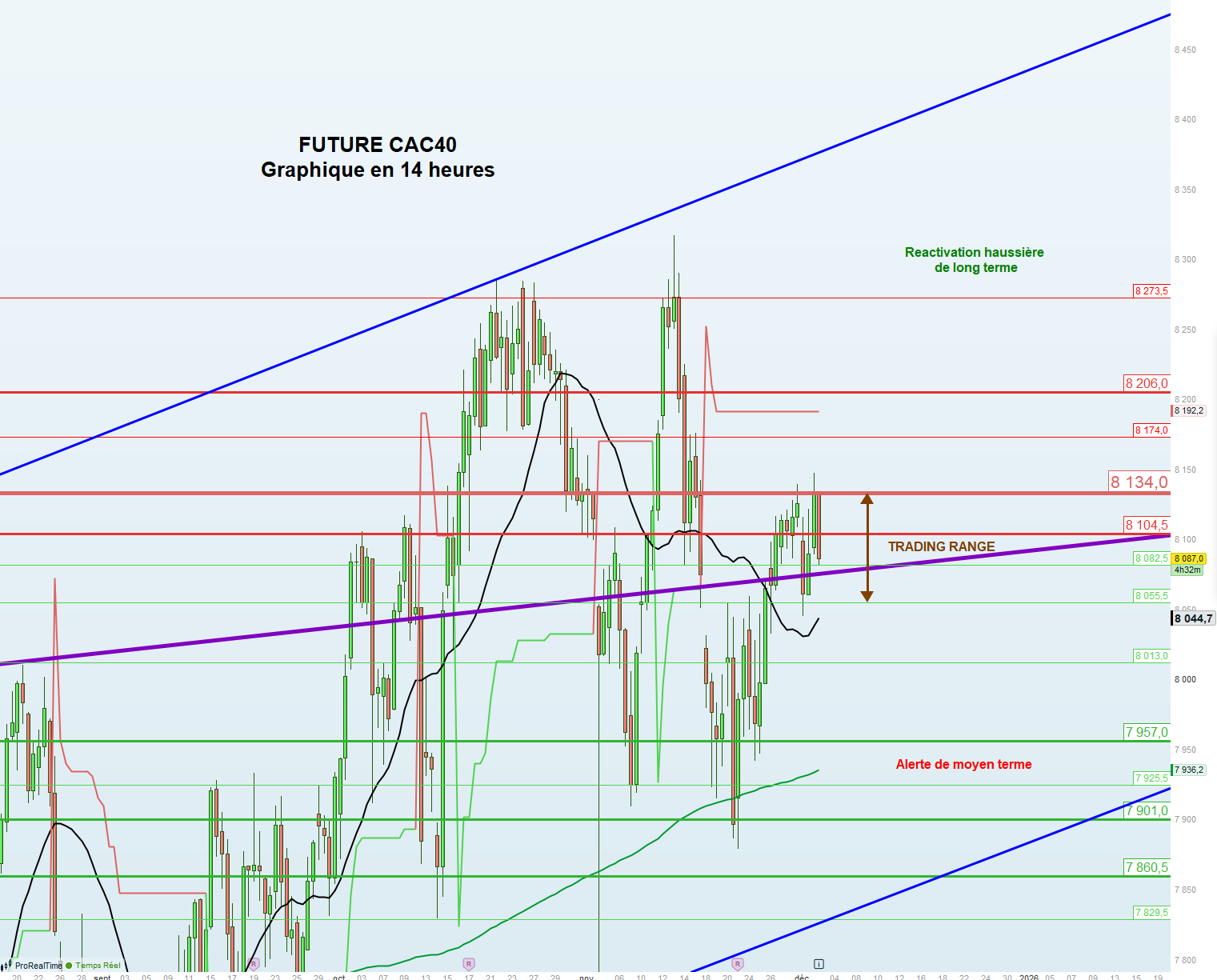 À l’inverse, une rupture de l’oblique pivot du canal haussier de moyen terme, combinée à une sortie par le bas de la zone de congestion, entraînerait un repli rapide en direction du support intermédiaire situé à 7 957 points. Tant que ce niveau demeure préservé en clôture, le biais reste neutre. En revanche, une rupture franche de ce seuil prolongerait le mouvement de consolidation vers la partie basse du canal haussier de long terme, positionnée à 7 829,5 points. Pour rappel, la zone de support comprise entre 7 696 et 7 644 points constitue une zone stratégique particulièrement surveillée. En cas de rupture, une accélération baissière demeurerait probable, avec un repli potentiel vers la ligne de cou de la figure de retournement en triple top, toujours active.