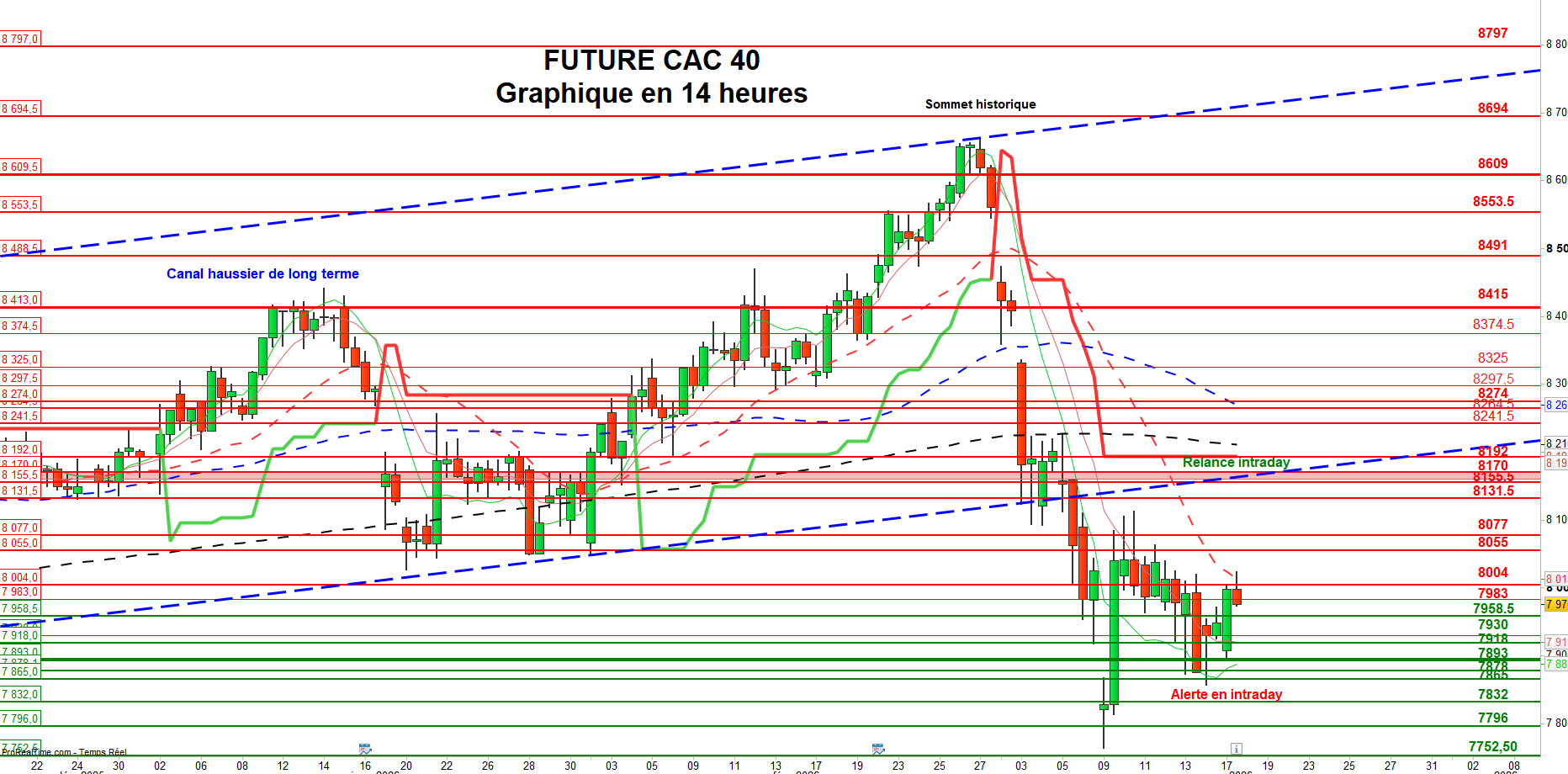 Le signal deviendrait encore plus négatif en cas de prolongation du repli sous le point bas du 9 mars, situé à 7 764 points. Dans ce scénario, une accélération baissière pourrait alors ramener les cours en direction de la zone des 7 600 points, correspondant à une projection à la baisse du canal haussier de long terme.