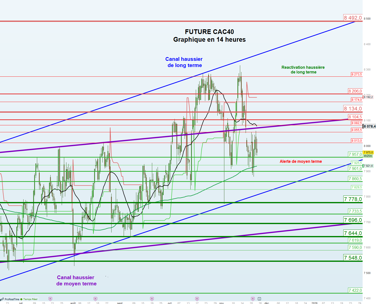 , le Future CAC 40 (cf. graphique en données 14 heures) poursuit son évolution erratique autour du seuil d’alerte moyen terme situé à 7 957 points, niveau dont il ne parvient pas à se détacher durablement. Une nouvelle incursion sous cette zone, suivie d’un enfoncement du support intermédiaire positionné à 7 901 points, relancerait la séquence corrective en direction de la base du canal haussier de long terme, identifiée à 7 811 points. Tant que cette oblique demeure préservée en clôture, le schéma directeur de fond reste inchangé et toute rupture réactiverait une accélération en direction de la zone de soutien comprise entre 7 696 et 7 644 points. Enfin, il convient de rappeler que la ligne de cou du triple top hebdomadaire, localisée à 7 048 points, constitue le seuil pivot dont la rupture réactiverait la dynamique baissière de long terme avec pour objectif théorique la zone des 5 896 points.