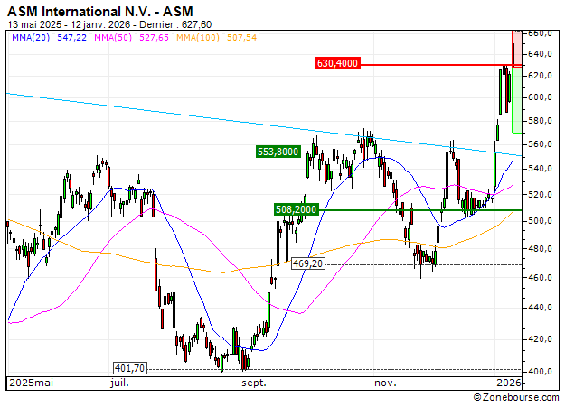 Le titre ASM International N.V. a connu une période de rebond ces dernières séances en direction de la résistance moyen terme des 630.4 EUR. Cette zone pourrait déclencher un signal de vente pour les investisseurs tentés de prendre leurs bénéfices sur la valeur, d'autant plus que les indicateurs techniques mettent en évidence une situation de surachat.