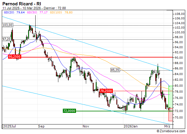 Le titre Pernod Ricard est récemment revenu au contact de la zone des 71.98 EUR, niveau qui a engendré une reprise technique à plusieurs reprises ces derniers mois.