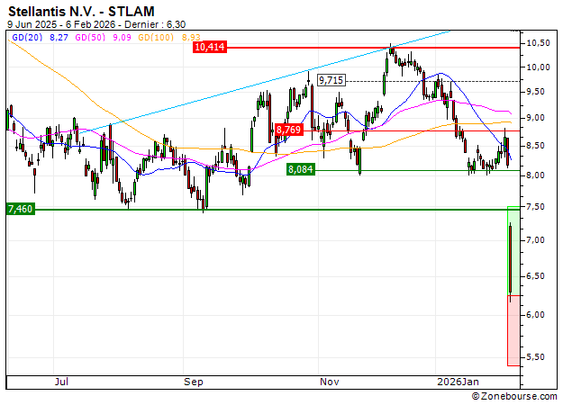 Compte tenu de ces éléments techniques, le timing apparaît opportun pour se positionner à l'achat sur Stellantis N.V. dans la zone de cours actuelle. On utilisera le warrant CALL Vontobel CA32V qui cote 0.56 EUR. Le potentiel de gain est de l'ordre de 60% pour ce produit dérivé et le seuil d'invalidation théorique, fixé initialement vers 5.2 EUR, limitera le risque à -30%.